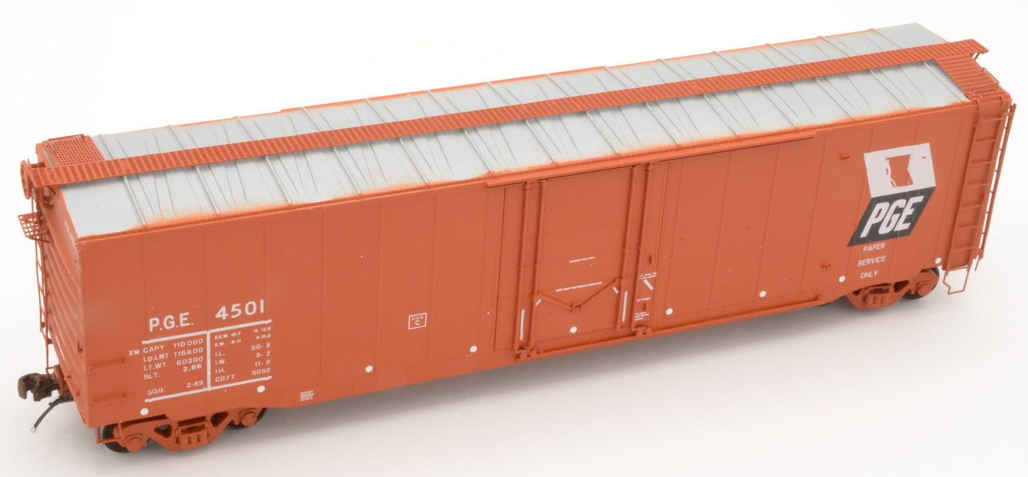The Hawker Siddeley PGE/BCR 50' newsprint cars, numbered 4501-4600, were part of a series of boxcars used by the Pacific Great Eastern (PGE) and later the British Columbia Railway (BCR) during the 1960s. These cars were specifically designed for transporting newsprint and paper products. Manufactured by Hawker Siddeley in 1966, they were equipped with features suitable for their intended cargo, such as plug doors to maintain cargo integrity during transport. The cars were finished in various paint schemes, including the PGE map scheme and the BCR dogwood scheme, reflecting the branding changes as the railway evolved. These boxcars were part of a broader fleet that served the railway's freight transport needs during a period of significant growth and development in the region